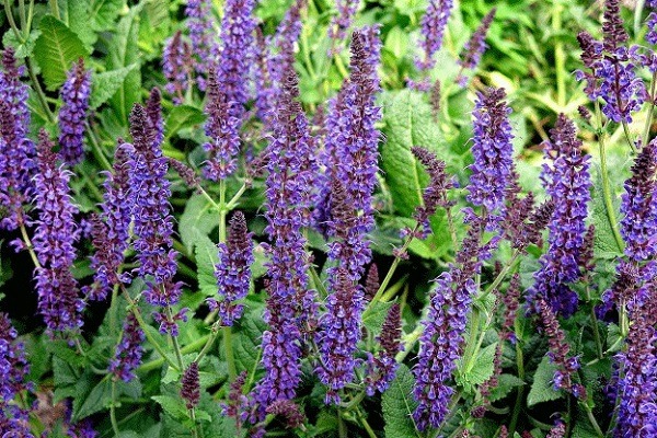 Cây thân thảo với cụm hoa cao vút. Salvia tím nổi bật khi trồng thành luống, mang ý nghĩa sự khôn ngoan và lòng biết ơn.