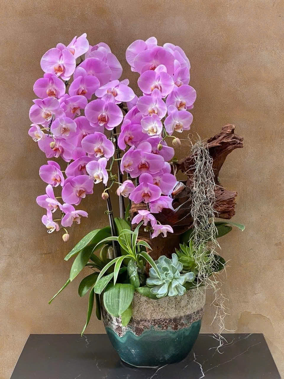 Chậu lan hồ điệp hồng nổi bật với những cánh hoa hồng dịu dàng, mềm mại, nở đều và tươi tắn. Hoa được sắp xếp hài hòa theo dáng đứng tự nhiên, tạo cảm giác thanh thoát nhưng vẫn sang trọng và cuốn hút.