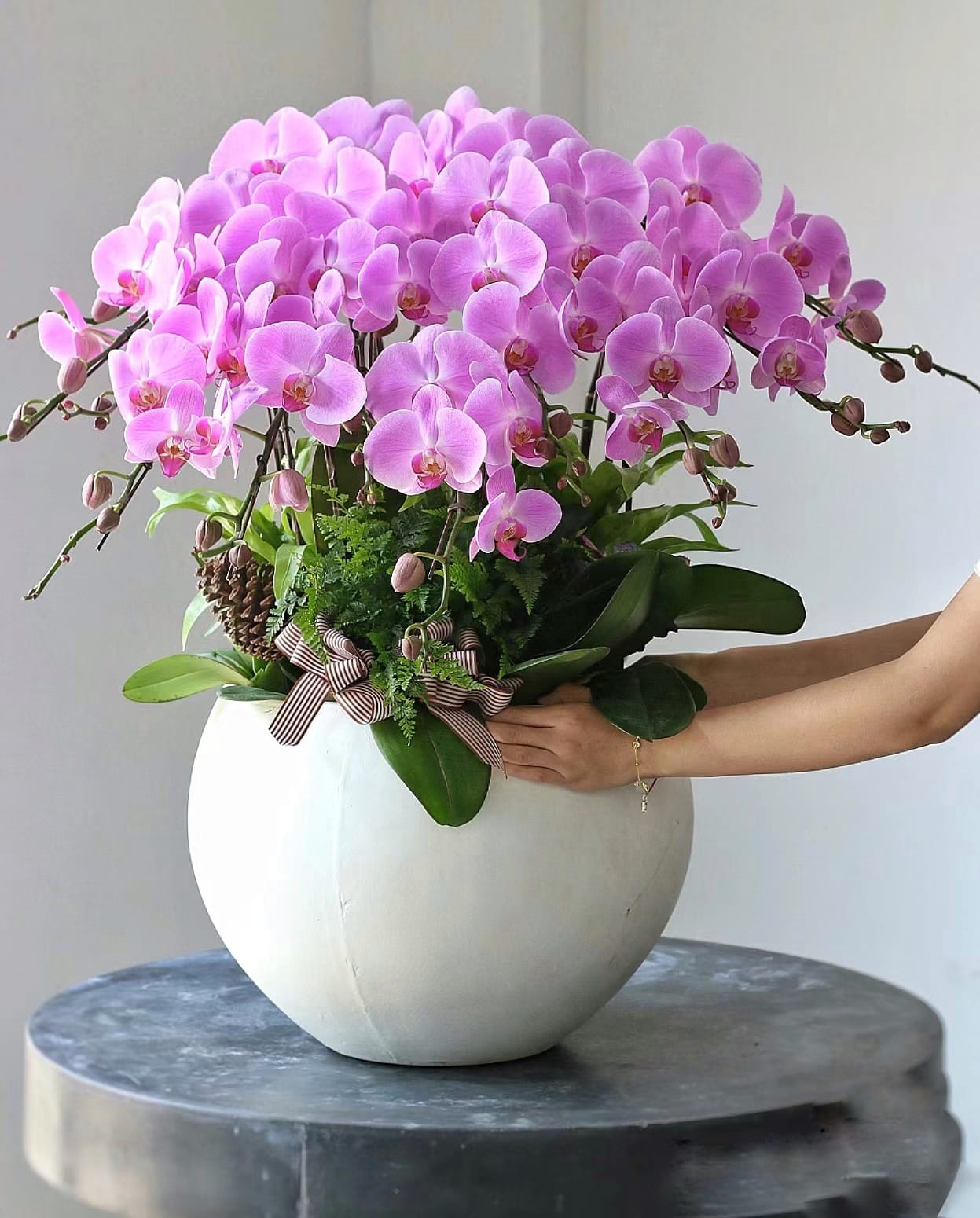 Chậu sứ trắng dáng tròn đơn giản nhưng tinh tế, được điểm xuyết thêm nơ ruy băng sọc nâu tạo điểm nhấn thanh lịch. Bên dưới những cành lan là tầng lá xanh bóng và tiểu cảnh dương xỉ mang lại cảm giác tươi mát, sinh động. Tất cả tạo nên một tổng thể hài hòa, sang trọng và cuốn hút.